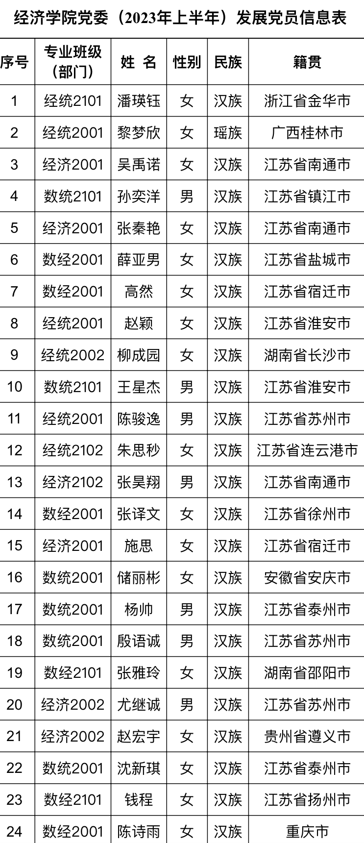 根据《发展党员工作实施细则》有关规定,经学院基层党支部考察、学院党委预审,拟接收潘瑛钰等24名同志为中共预备党员。现将名单予以公示: