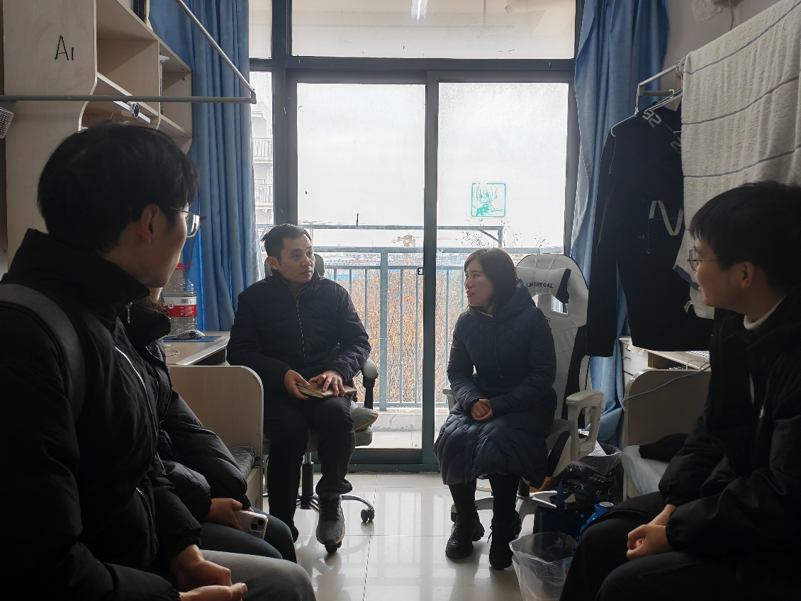 研究生第二党支部支部书记汤美微及学生代表参与其中。韩中老师亲临部分学生宿舍,与研究生们亲切交谈,旨在了解学生思想动态、学习生活、宿舍情况,为学子们送去冬日里的关怀与温暖。