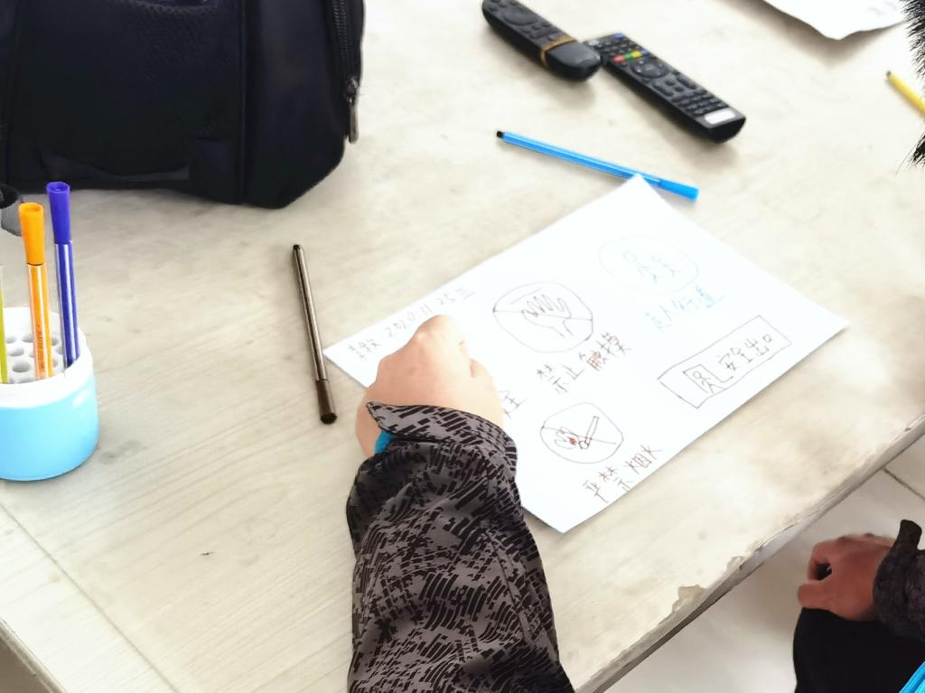 在掌握了常见安全图标学习以后,便进入了绘画练习环节。学员们结合之前所学习到的相关知识,在志愿者的辅助引导下模仿安全图标进行绘制。