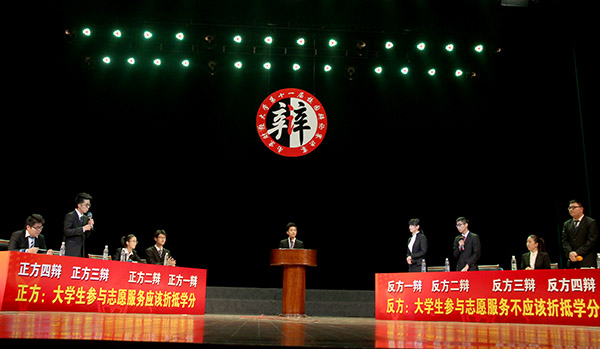代表队(正方)从大学生的角度出发,从志愿服务抵扣学分有利于大学教育的日益完善、学生综合素质的提高,能激发学生的志愿服务精神、引导更多大学生走上志愿服务岗位等方面分别展开阐述;法学院代表队(反方)则结合“汶川大地震”等具体事例,指出志愿服务折抵学分与志愿精神相违背,将导致志愿服务的形式化。双方辩手你来我往,随机应变,旁征博引,互不相让。随后的质辩环节和自由辩论环节更是将赛事推向高潮,我方辩手机智敏捷、口若悬河而不失风度,反方辩手亦以针尖对麦芒之势步步紧逼、针锋相对。最后,双方进行总结性陈词,双方四辩对己方观点做了深度阐释,展现了出色的口才、良好的风度和敏捷的才思,赢得了现场观众的阵阵掌声。