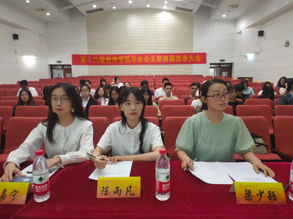 学生会换届选举大会。院分团委老师梁少颖,学生会主席团成员陈雨凡、刘嘉宁以及学生会全体成员参加了会议。
