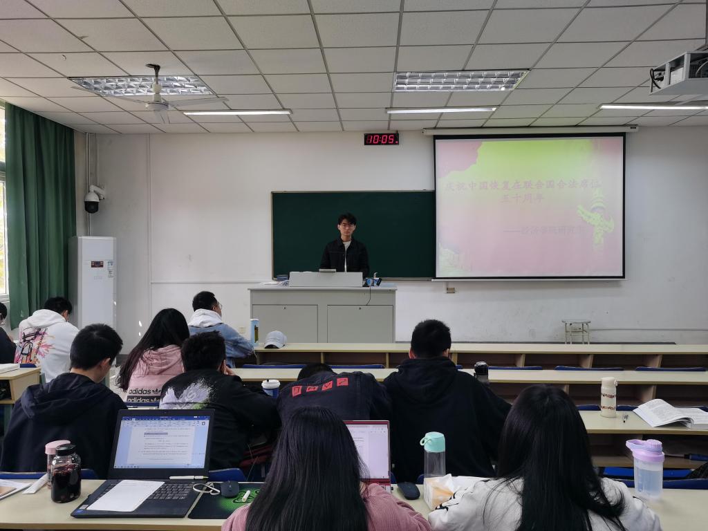 会议开始,他为同学们介绍了新中国为申请恢复联合国合法席位的艰难历程,并讲述新中国恢复在联合国合法席位的重要意义:这既是中国重返世界舞台、融入国际体系的一个重要起点,同时也为联合国权威和地位的维护,国际公平正义秩序的建立,世界各国人民的团结合作等事业做出了卓越贡献。50年前的今天,中国在第二十六届联合国大会以压倒性多数通过第2758号决议,大会决定恢复中华人民共和国在联合国的一切权利,承认中华人民共和国政府代表是中国在联合国的唯一合法代表。