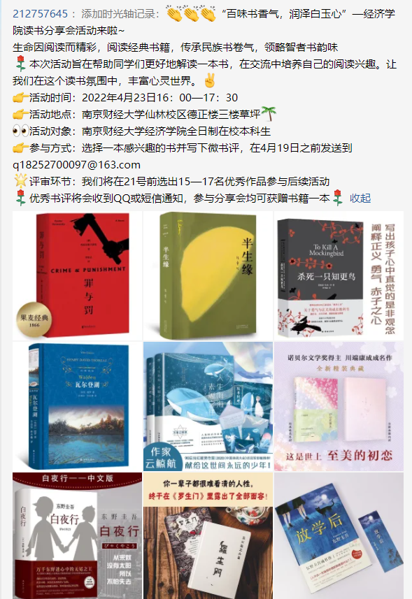 官微“南财小经灵”中进行展示外,还邀请获选同学参加4月23日世界读书日当天举行的线下阅读分享会。