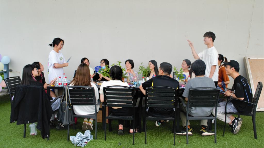 初夏的明媚午后,微风不燥,阳光正好,心理健康沙龙活动开展的如火如荼。“525”三个粉红色充气字符装点着栏杆,色彩缤纷的气球散落在桌下,将绿茵茵的草坪装饰得可爱又灵动。活动在“很高兴认识你”的破冰活动中拉开序幕,师生们通过小游戏来增进对彼此的认识和了解,活动现场的欢声笑语不断,现场的氛围愈发轻松愉快。