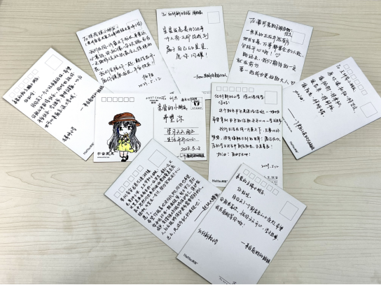 志愿者给安徽肖坡小学、贵州毛草坪小学的孩子们手写明信片寄语