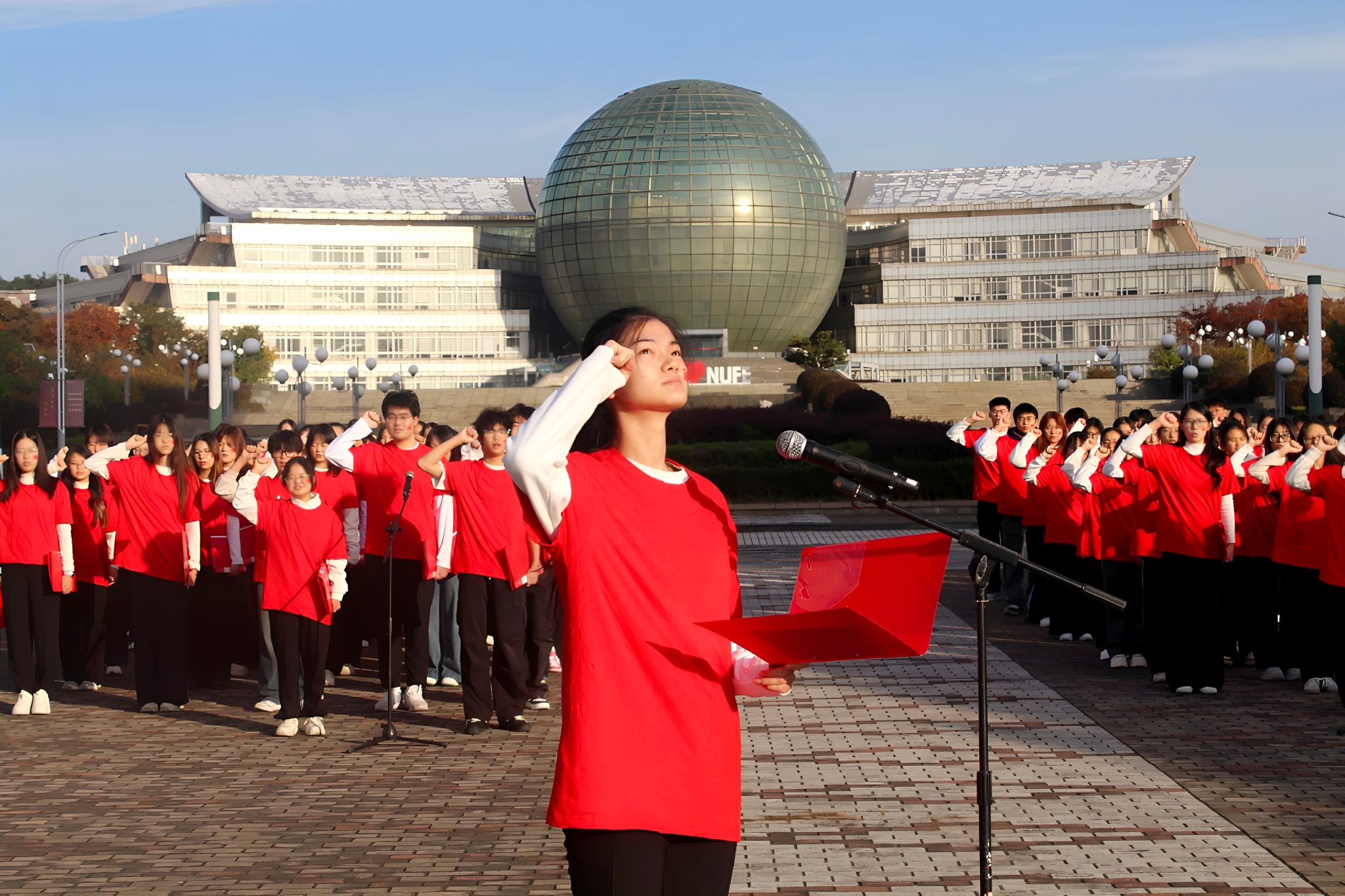 升旗仪式后,学院学生党员代表沈房作国旗下演讲。她结合校训“自谦、自信、务实、超越”,深刻阐释其精神内涵,并号召同学们牢记校训、勇担时代使命,以奋斗之姿书写无悔青春。