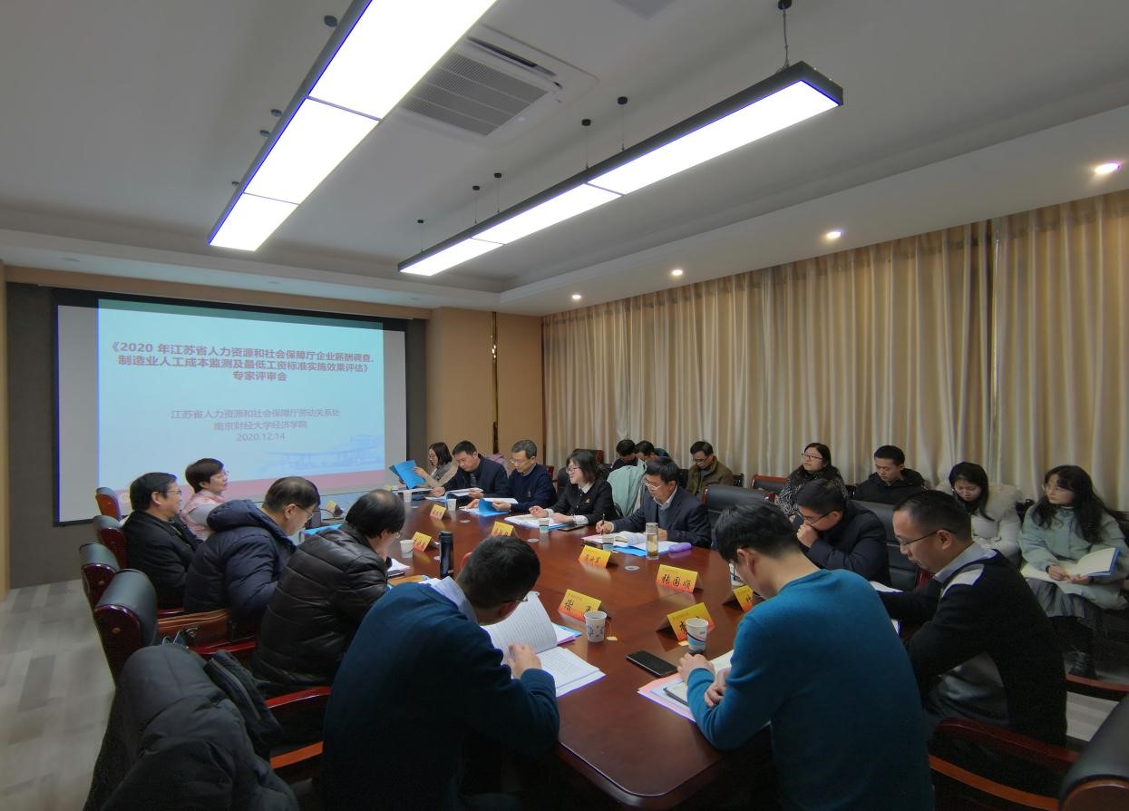 的科研和社会服务提供持续的支持。我校教务处处长、最低工资标准实施效果项目负责人叶林祥教授向评审专家汇报了《2020年江苏省最低工资标准实施效果评估报告》,企业薪酬调查和制造业人工成本监测项目负责人王万珺副教授汇报了《2020年度江苏省企业薪酬调查报告》。各位评审专家在认真听取了汇报后对报告,认为项目资料搜集充分、研究扎实、政策建议具有较强的针对性和可操作性,对报告从形式到内容也提出了许多中肯的建议及完善和修改意见。课题组成员对专家们的意见和建议表示了感谢,并表示会后将在专家建议的基础上认真修改完善报告。
