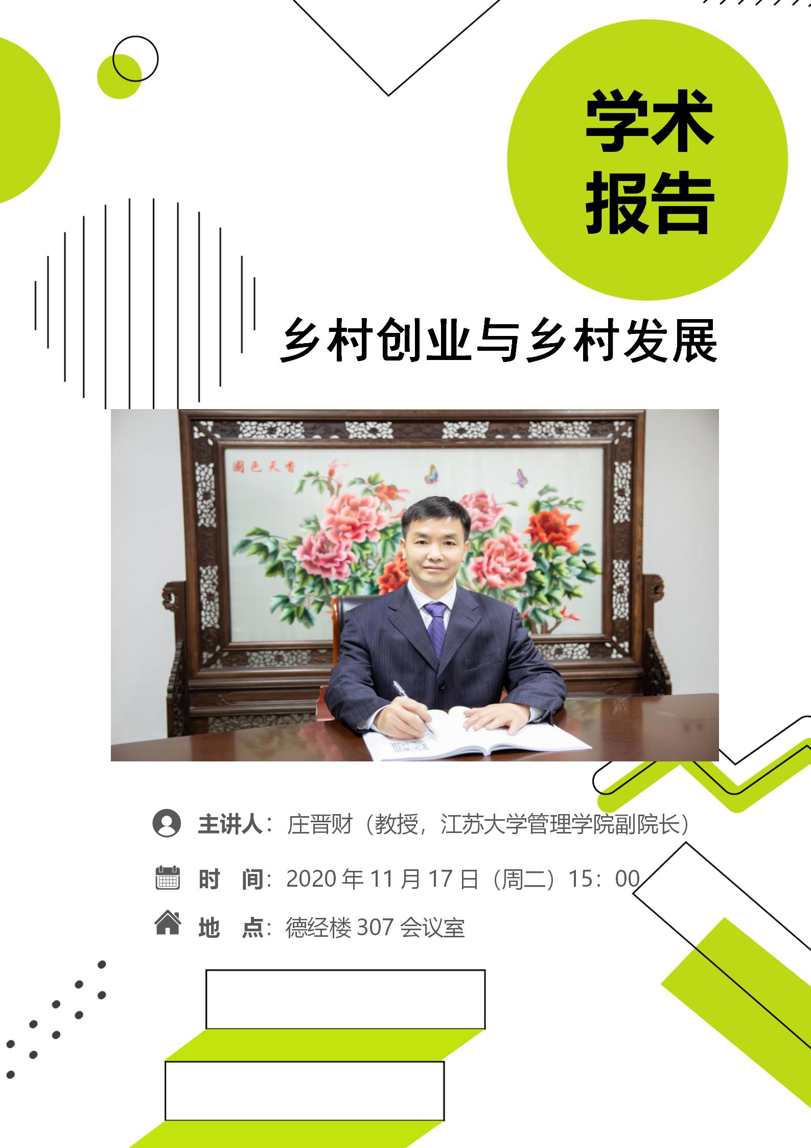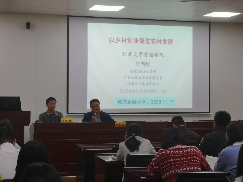 邀请,江苏大学管理学院副院长庄晋财教授在仙林校区德经楼307会议室做题为《以乡村创业促进农村发展》的报告,学院师生代表50余人参加了报告会,报告会由toptoon