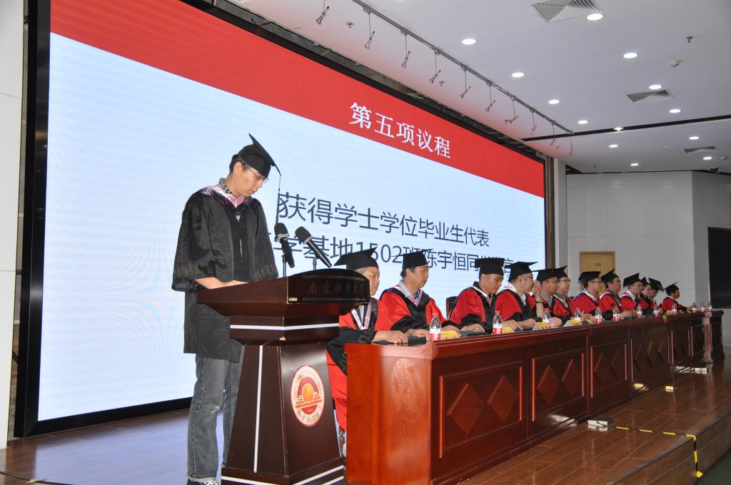 基地1502班陈宇恒同学作为毕业生代表发言。他首先向辛勤培育同学的领导与老师表示由衷的感谢,向全体毕业生表示真诚的祝福。他回顾了四年大学生活的每一瞬间,分享了四年来发生在toptoon