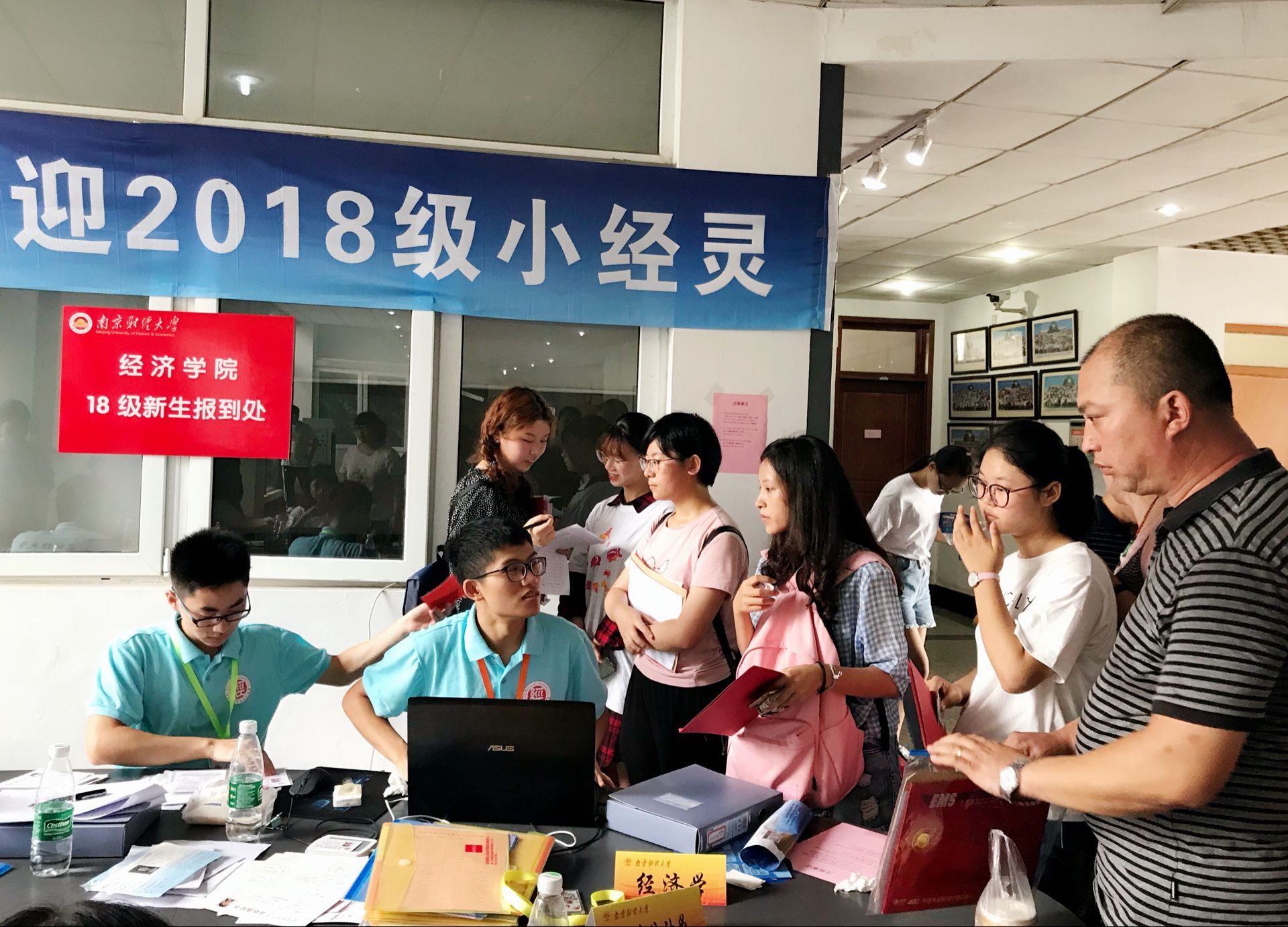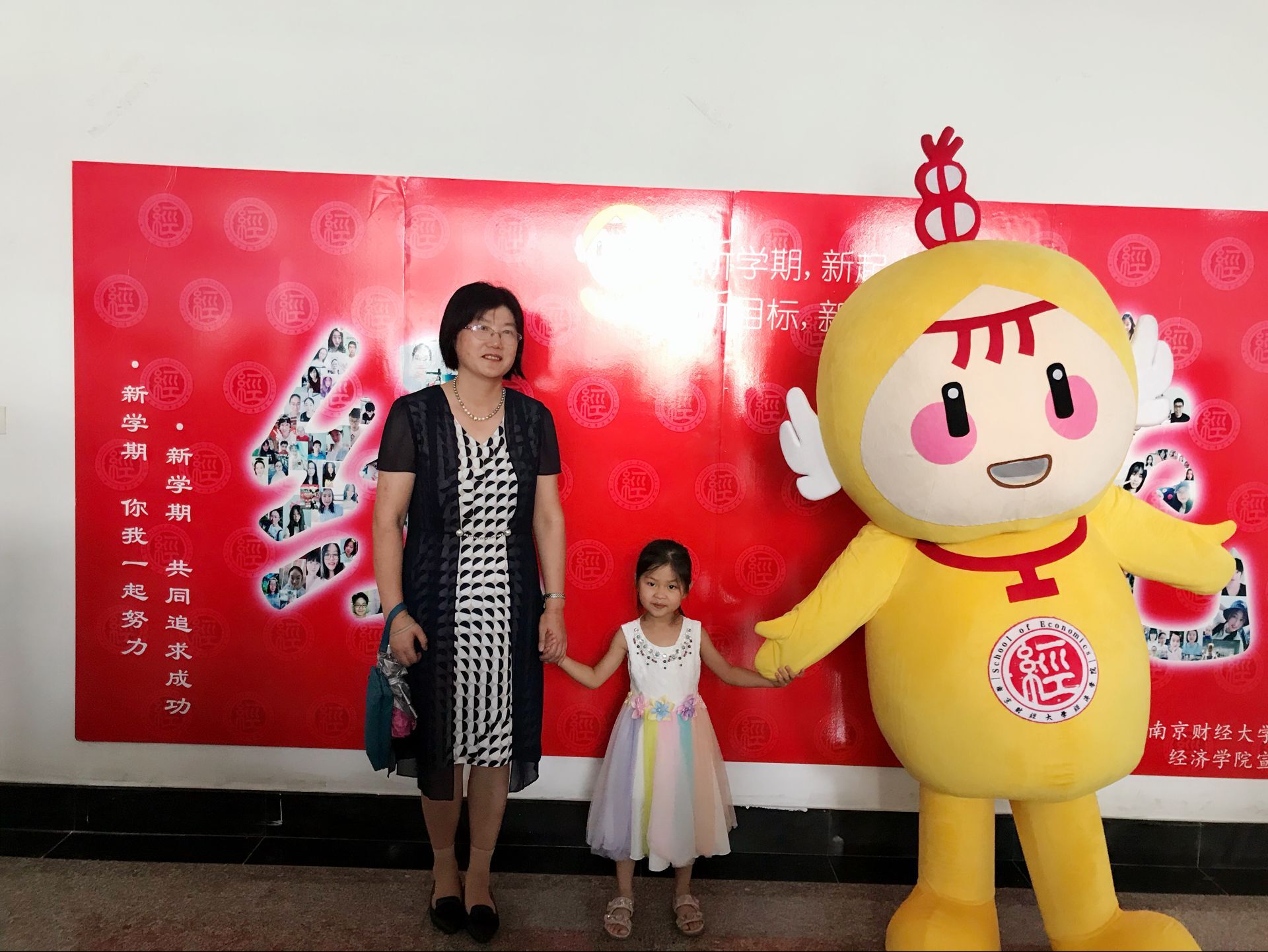吉祥物“小经灵”:黄色的衣服、憨态可掬的笑容,打招呼、卖萌、求拥抱、求合影,让初来学院的新生们感受到大学的轻松和温暖。登记结束后,新生和家长们在由新生笑脸照片分别拼成的“经“和”统”字样的照片墙处与小经灵合影留念。宋学锋校长和邱伟芬副校长也在百忙之中亲临迎新现场,了解新生的入学情况,并与小经灵合影。