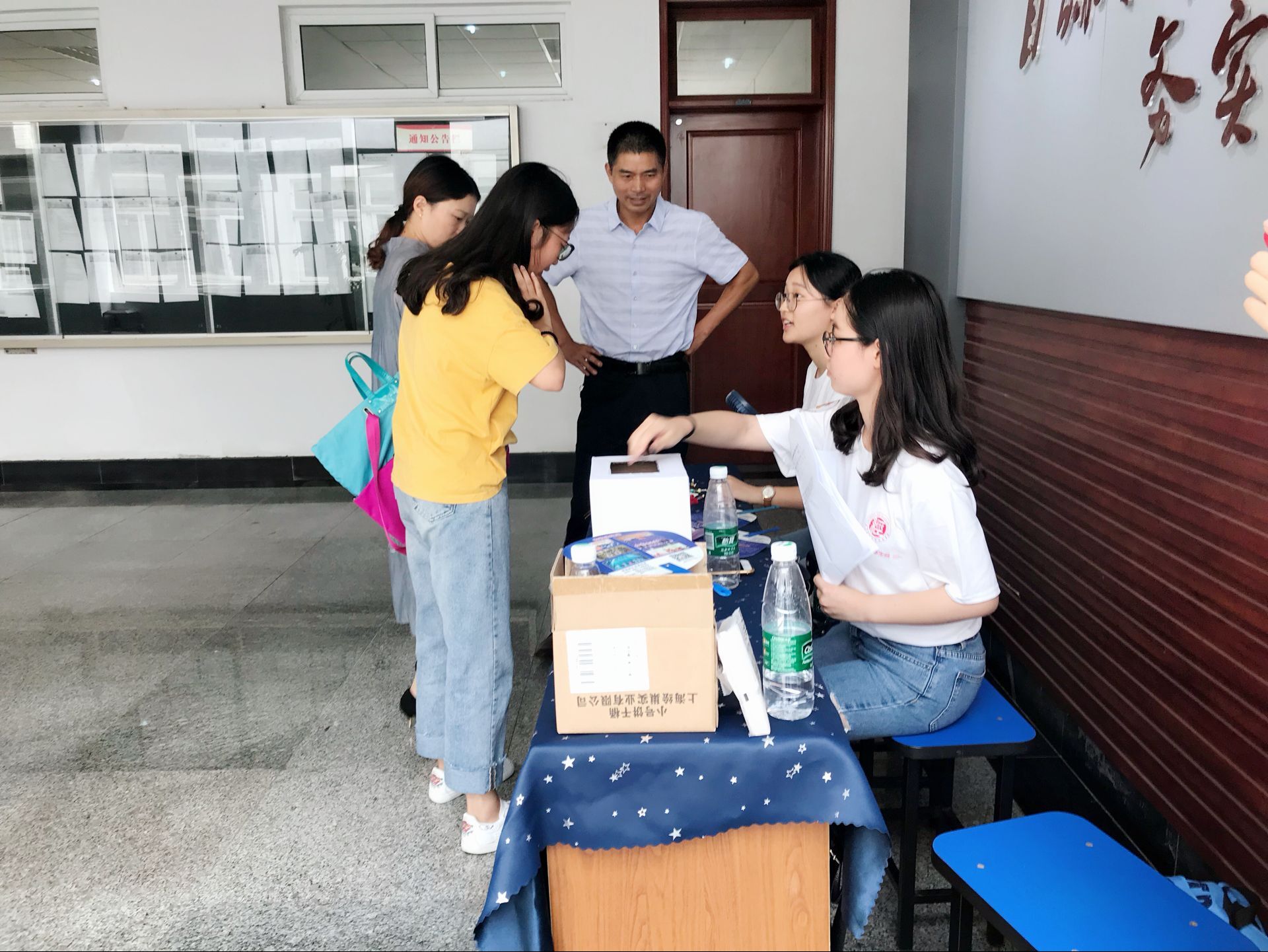 虽然时间尚早,但已有新生前来报到,德经楼三楼逐渐被忙碌的气氛包围,老师和志愿者们有条不紊地进行着一站式学籍注册,报到登记,发放资料,并邀请同行的家长参加下午的家长会。 报到处最为出挑的可能是志愿者装扮的toptoon