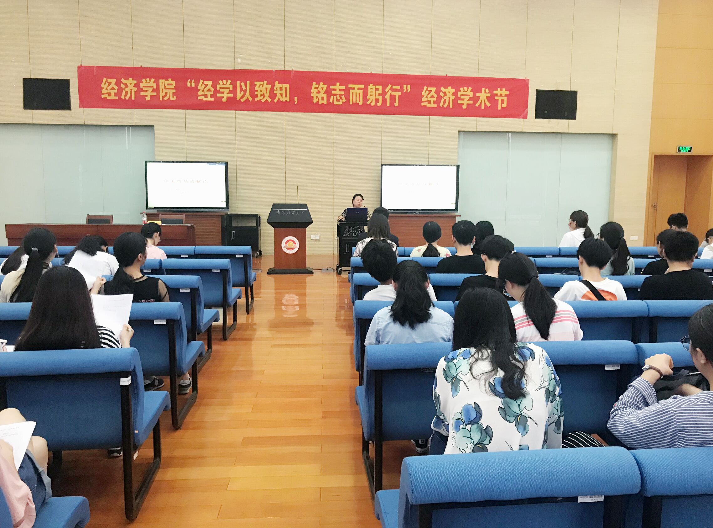 赵春玲教授作了题为“中美贸易战解析”的讲座,从中美贸易战原因、中美贸易的计算、中美贸易不平衡产生的原因、特朗普贸易战组合拳观察以及中美贸易战的实质五部分对中美贸易战进行解读。她由“301调查”事件切入,从全球经济一体化说起,介绍了“中国制造2025”和“301调查”等生动事例,分析中美贸易战对中美两国经济的影响。她还引入中美“打贸易战”时双方激烈的应对措施,并借助数据资料,带领同学们从经济学角度解读中美贸易战中相关的经济问题。