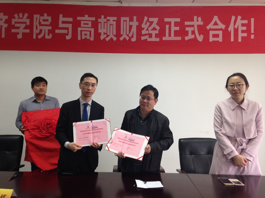专业设置、师资队伍、办学特色、人才培养等情况,并代表学院对高顿财经在此次合作中付出的努力表示感谢。他指出,实训项目更加注重学生实践能力和专业技能的培养,可以使学生在专业知识学习与企业人才需求之间实现有效对接。他并对同学们寄予殷切希望,希望同学们能端正学习态度,珍惜学习机会,锻炼出真才实干的“硬功夫”。随后,双方郑重签署合作协议,并举行了揭牌仪式。