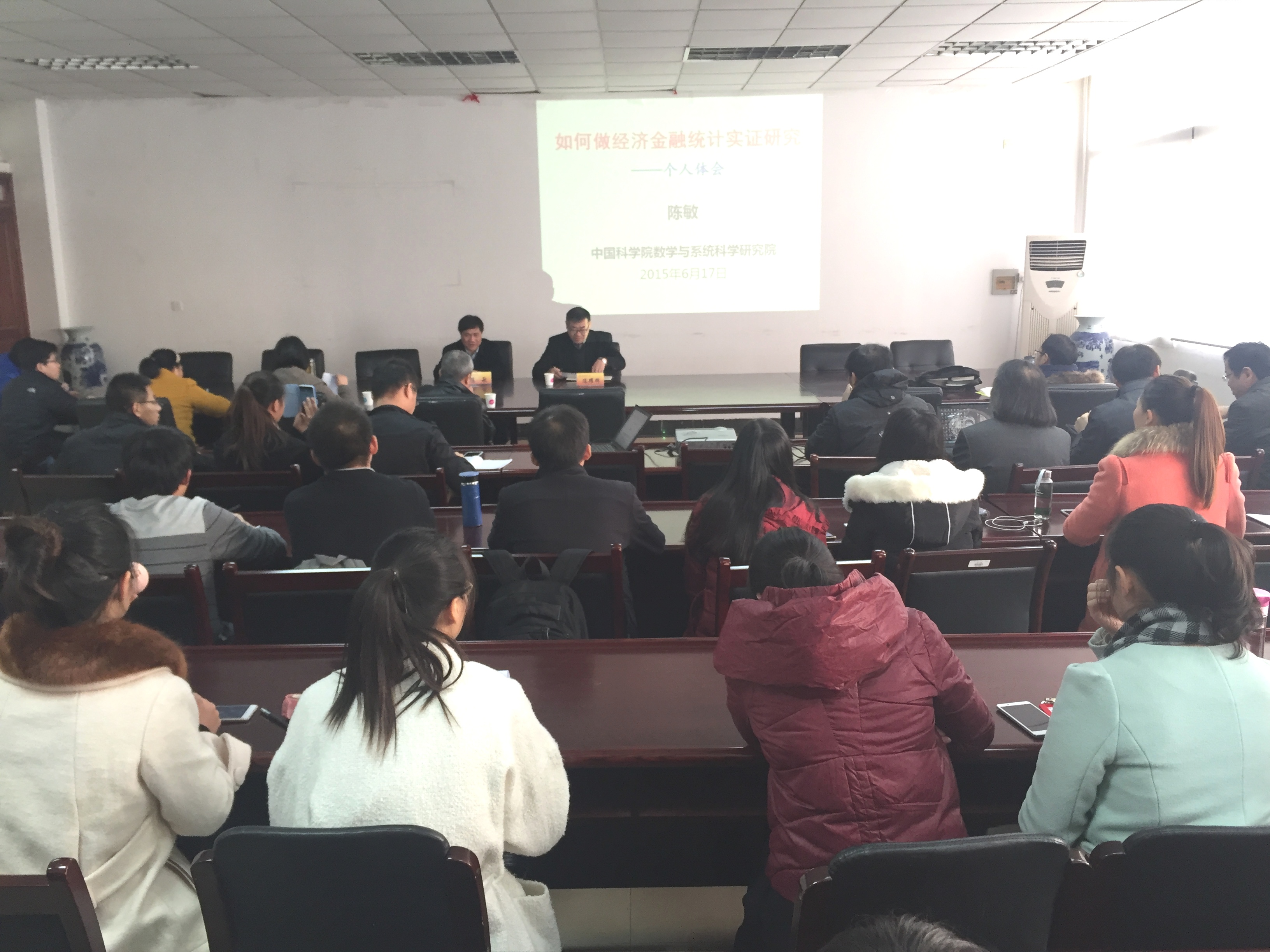 陈敏教授以什么是实证研究出发,讲述了实证研究的方法步骤及其所推崇的基本原则。他以“外汇储备规模测算”、“中国股票市场有效性研究”为例,详细说明了如何做好经济金融统计的实证研究。在“外汇储备规模测”得例子中,他以指标的可比性出发,进一步研究了如何进行变量的选取、数据的处理、模型的建立。并通过对欧元区、日本、美国的分析说明不同经济体有其独特的运行规律。在“股票市场有效性”的例子中,讲述了股票市场的核心在于股票的不可预测,并详细阐述了选择合理模型的重要性。报告结束后,陈敏教授与师生进行了关于模型误差等问题的热烈讨论与交流,加深了对统计学知识在金融投资中的应用研究的认识。