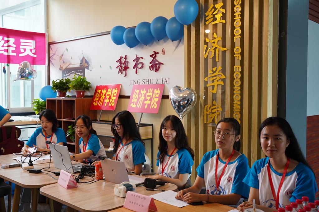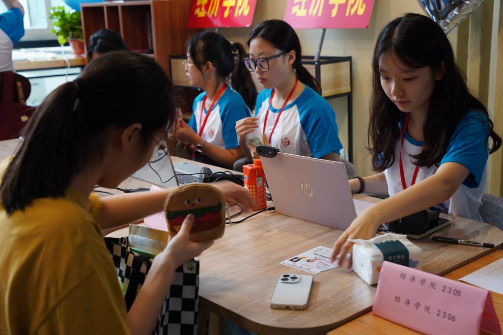 启航驶向星辰大海的“逐梦青春号”船票展板,学院的专业楼德经楼为船舱、新生们的学号为证件号,寓意经院学子们登船开启为期4年的学习时光,乘风破浪,扬帆远航,逐梦新征程。学子们在船票票根写下求学寄语并签名后粘在迎新墙上,更增强“榜上有名”的仪式感。学院还精心为新生准备了富有经院特色的入学纪念品,包含“小经灵”钥匙扣、船票票根、南财明信片、新生防诈骗指南以及定制帆布包等,通过温馨礼物的方式密切学生和学院的联系、培养爱校情怀,可谓仪式感满满!新生们纷纷与写满学院领导老师点赞留言的朋友圈打卡框、学院吉祥物“小经灵”和南财地标图书馆“大球”合影,开启缤粉多彩、有滋有味的大学生活。