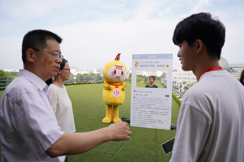 领导与新生及家长在写满学院领导老师点赞留言的朋友圈打卡框旁合影