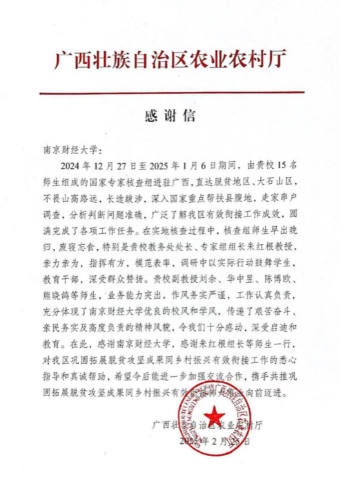 发来感谢信,高度赞扬由我校教务处处长朱红根教授带领的国家专家核查组师生团队在广西巩固拓展脱贫攻坚成果同乡村振兴有效衔接工作中的卓越贡献。