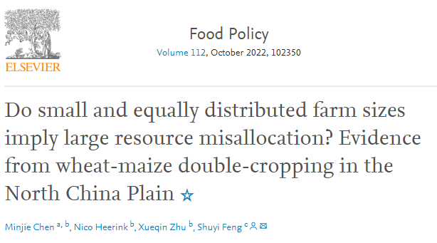 经济学系青年教师陈敏杰博士以第一作者身份与其合作者荷兰瓦赫宁根大学Nico Heerink教授、Xueqin Zhu教授、南京农业大学公共管理学院冯淑怡教授,在FoodPolicy发表题为《Do small and equally distributed farm sizes imply large resource misallocation? Evidence from wheat-maize double-cropping in the North China Plain》的学术论文。